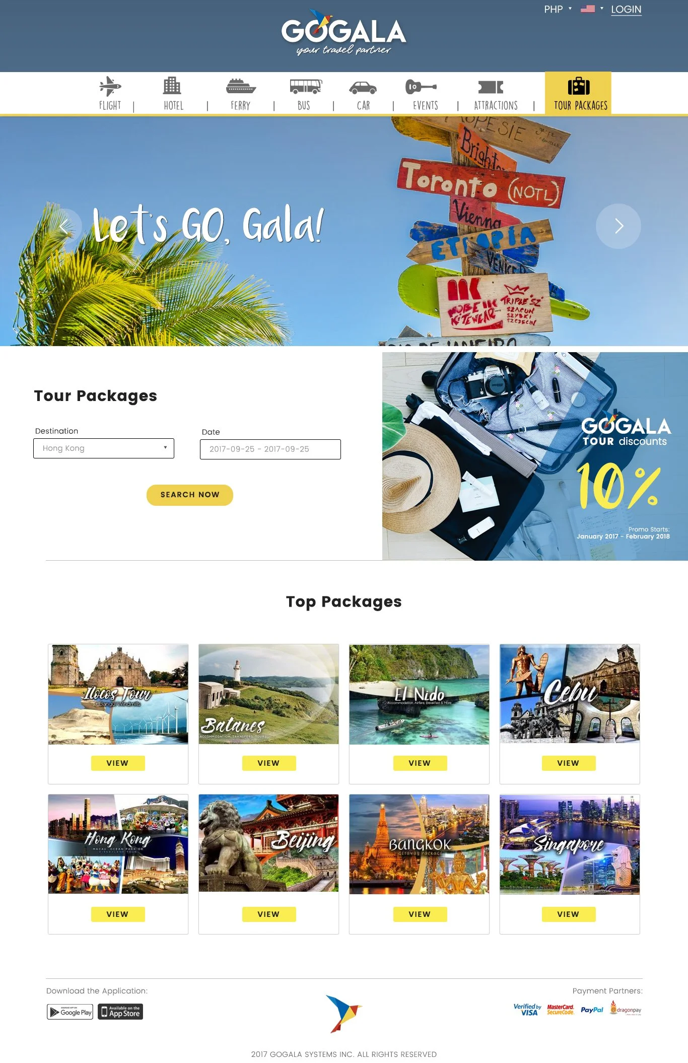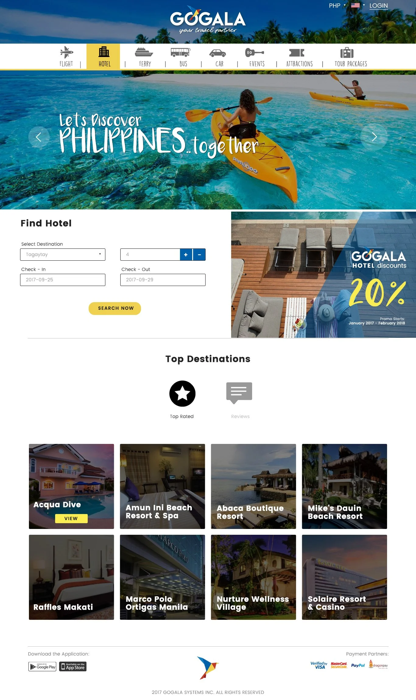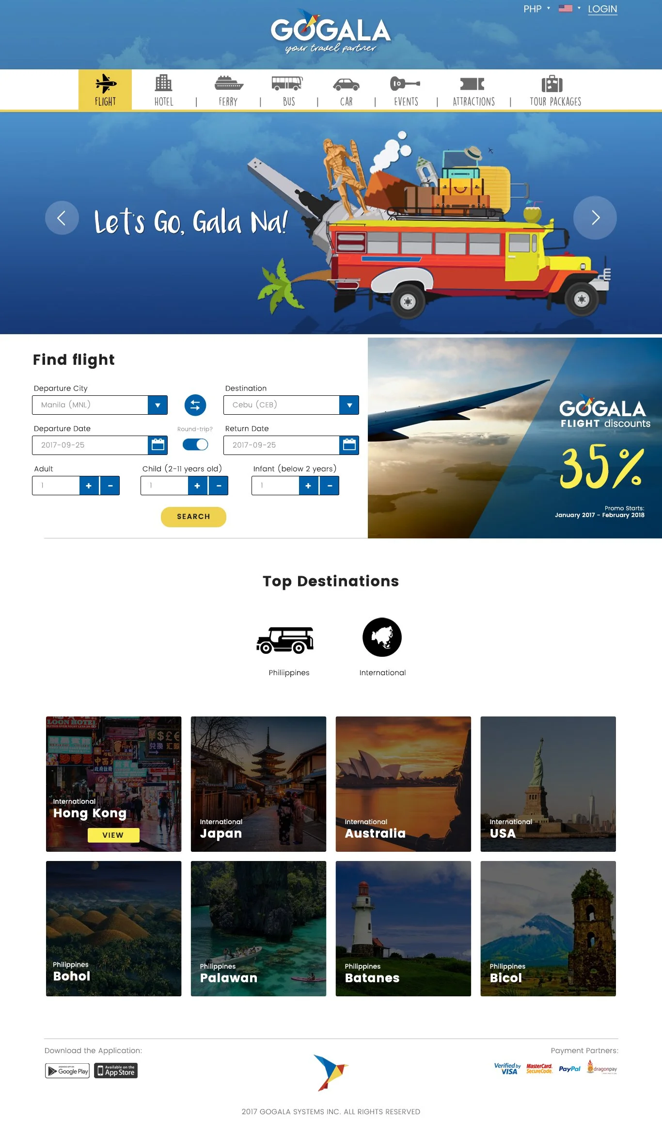 GoGala is a travel booking website focused on Philippine destinations, offering flights, buses, ferries, hotels, events, and tour packages. The platform was initially built to serve local travelers, with plans to expand internationally.