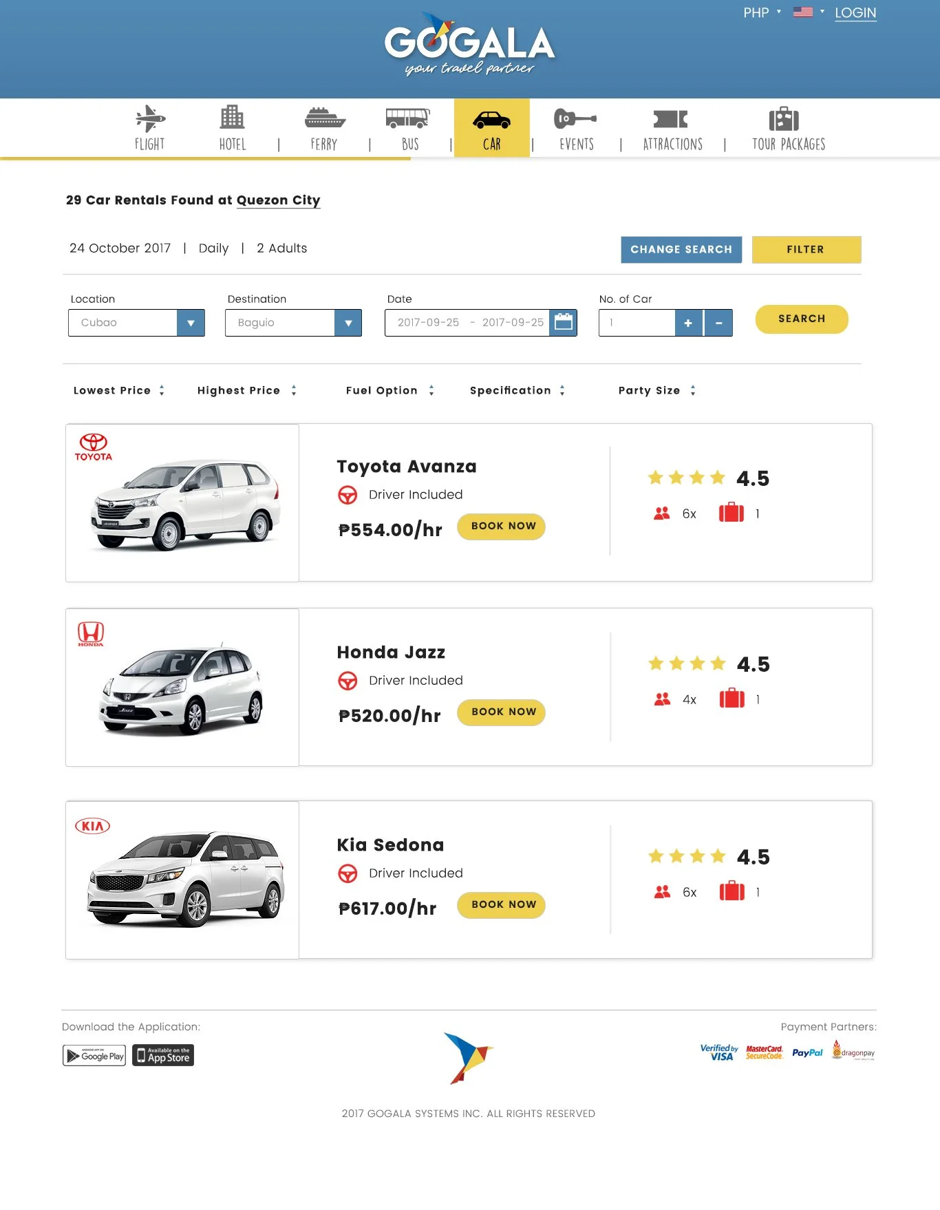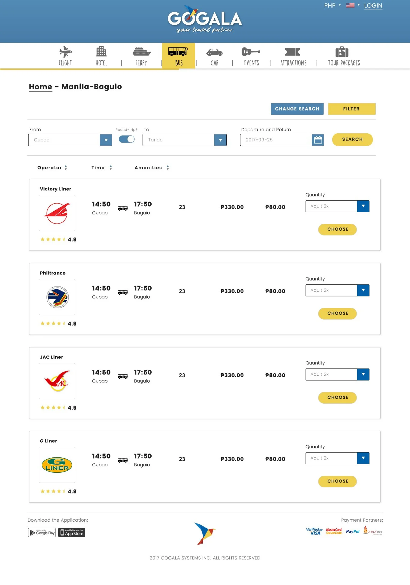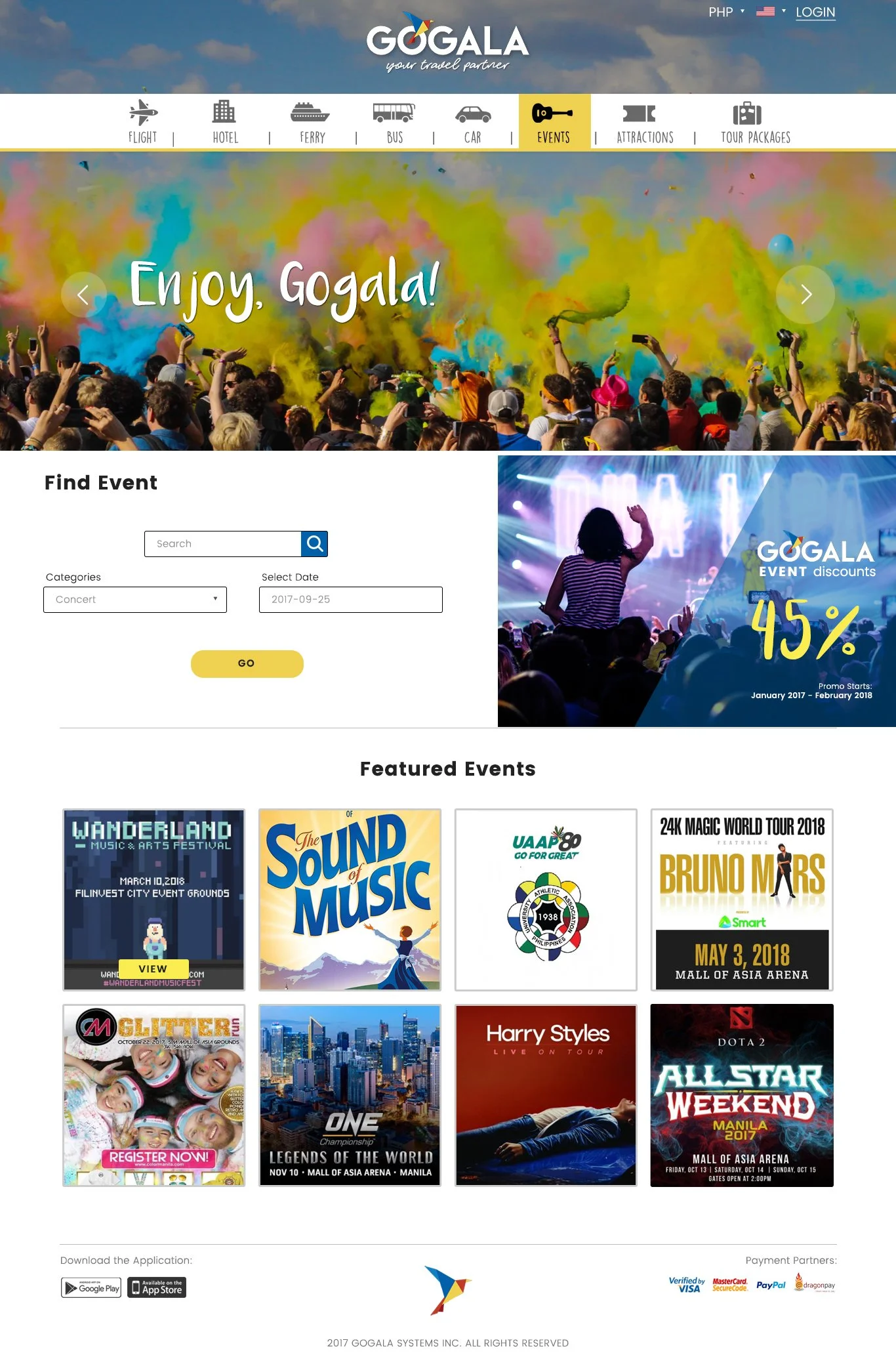 GoGala is a travel booking website focused on Philippine destinations, offering flights, buses, ferries, hotels, events, and tour packages. The platform was initially built to serve local travelers, with plans to expand internationally.